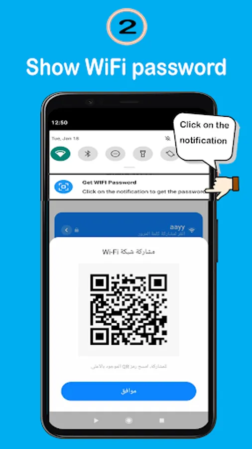 2. Click on the network you are connected to the QR code will be displayed. Click on the App notification at the top and Wait a second, Wi-Fi password will be shown