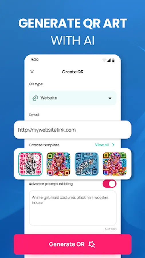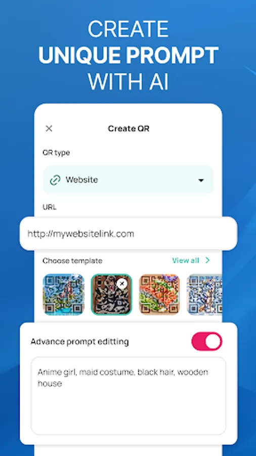 Created from a combination of QR code and AI art technologies, our app not only works as a regular QR code scanner but also as a QR art generator. It can help you create and customize your personalized art QR code, which will definitely impress you with its outstanding visuals. Choose your QR type, describe the artistic QR code you want, and you will immediately have your unique QR art as you wish.