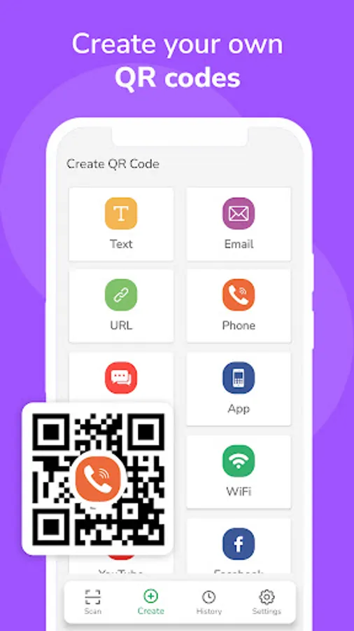 - To generate QR codes: simply open the QR code scanner and barcode reader app -> select "Create" at the bottom menu. There are many types of QR codes that you can generate based on your requirements, such as website URL, text, contact information, phone number, SMS, calendar event, etc.