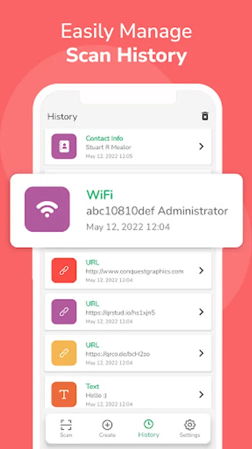 ✔ Scan history saved: A record of all scanned and created QR codes and barcodes is permanently saved in history, and easy to manage and clear the history.