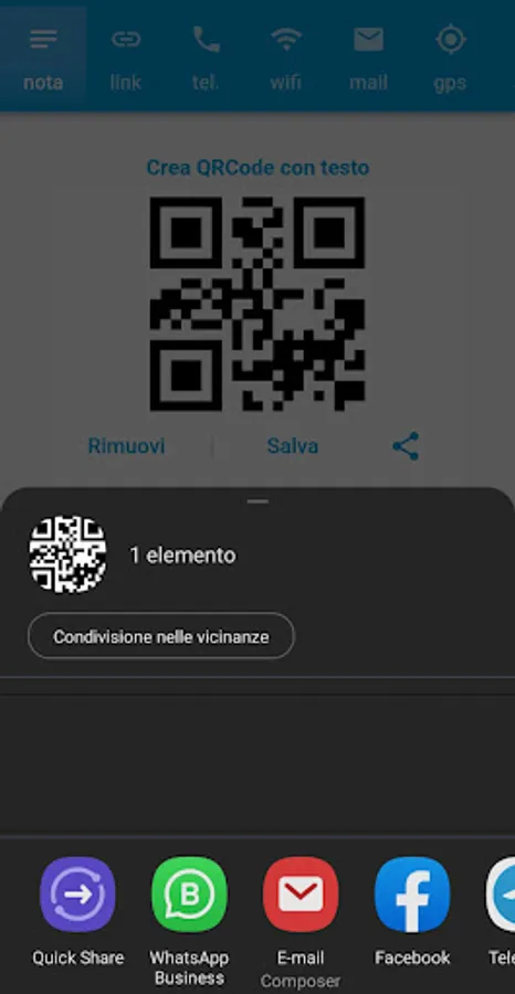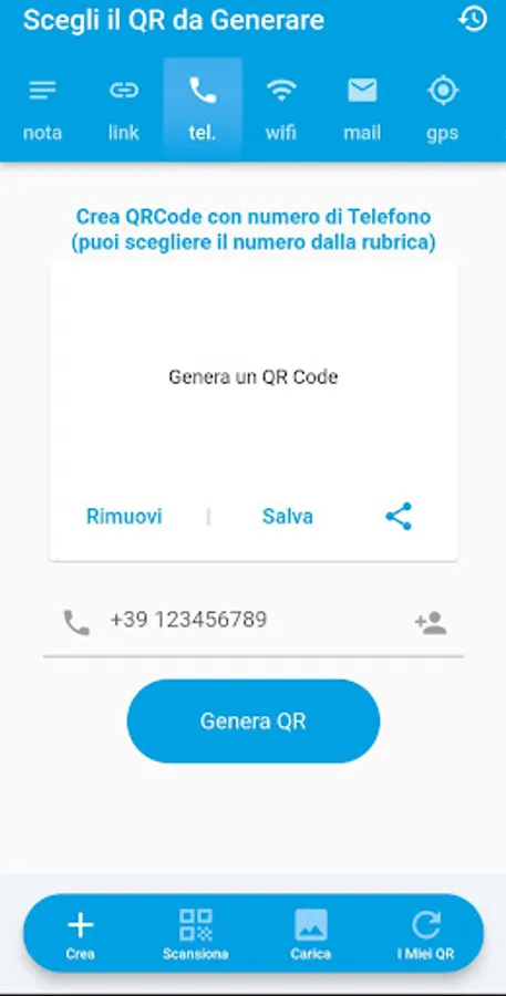 The generator is very easy to use, just choose the type of QRCode to generate and fill in the data, then you just need to touch it to share it via any app.