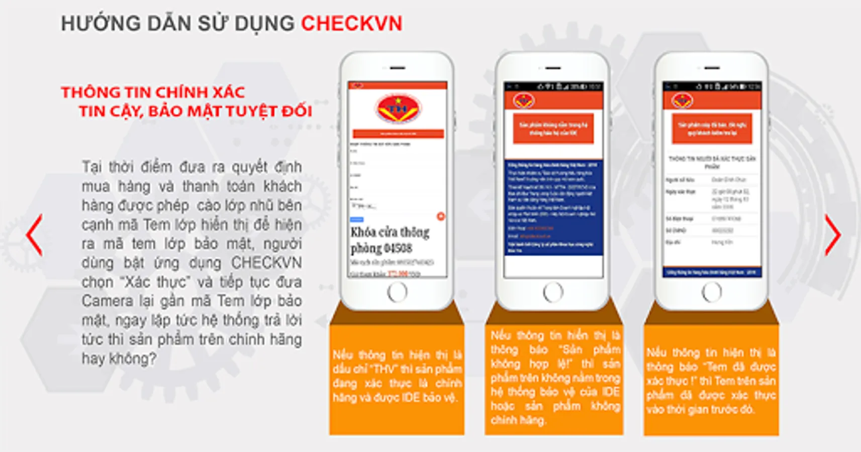 Consumers download smartphone applications on your CheckVN and authentication products, goods genuine, authentic stamps through stickers on products, goods. Through consumer camera scan authentication stamps to get accurate information about the product.