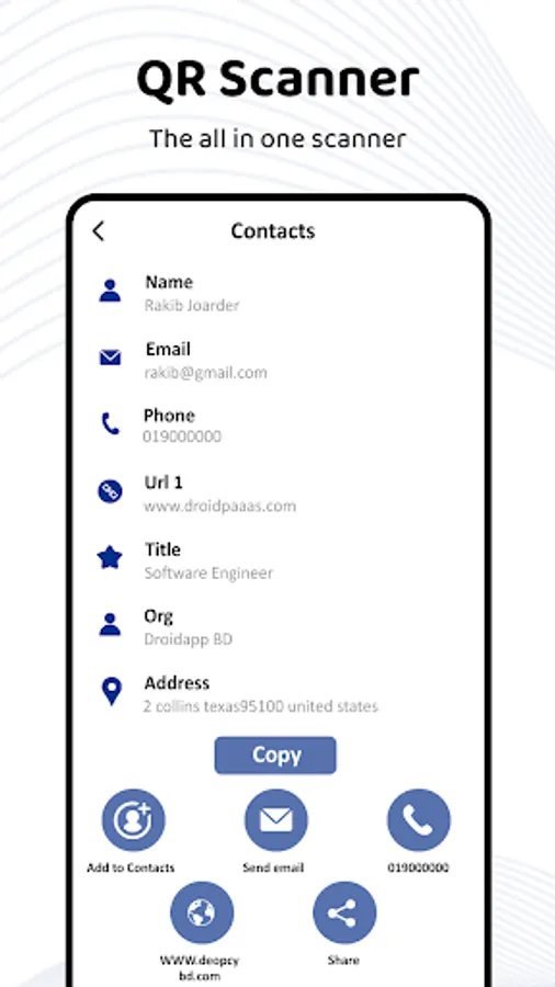 Free QR code Scanner easily Scan & Create all types of QR codes/barcodes, including URL, text, Wi-Fi, location, E-mail, products, contacts, books, calendar, etc.