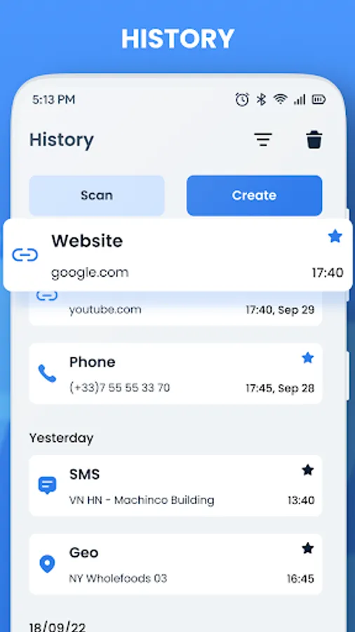 🏷 History: Includes all created or scanned QR codes/barcodes, as well as various code-related functionality such as View information, Open link, Copy, Save contact, etc.