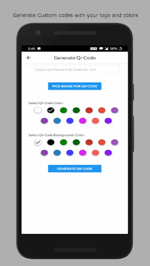 • Generate custom Qr codes with logo and Colours