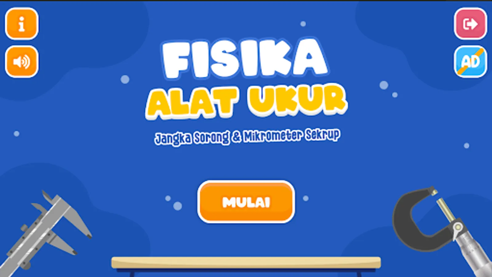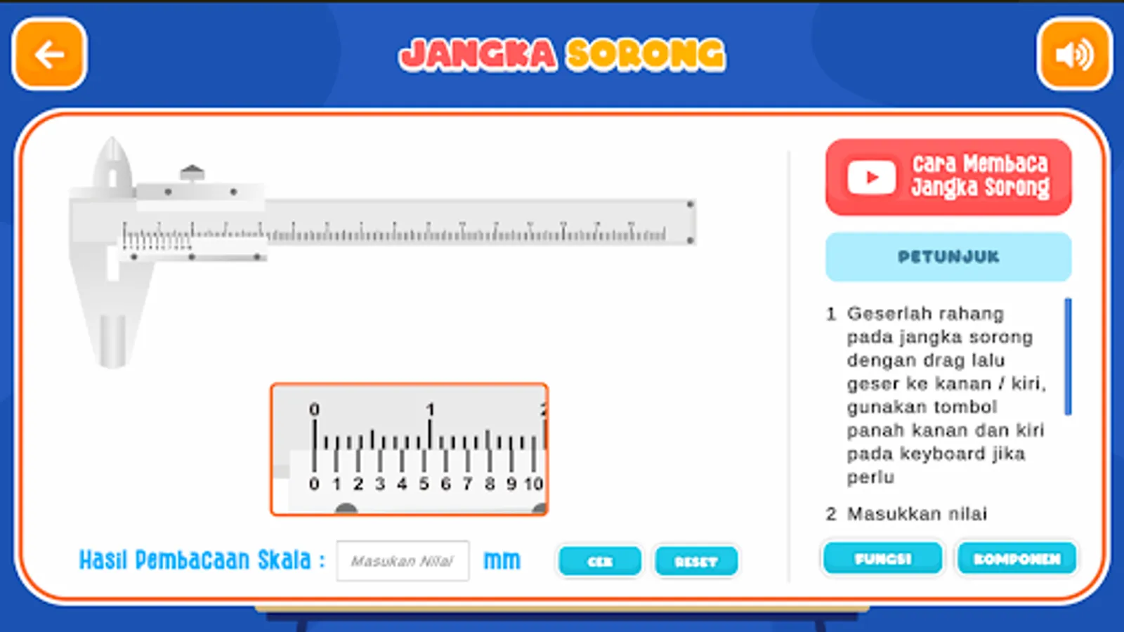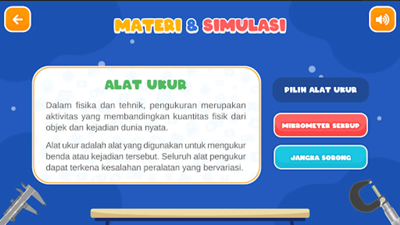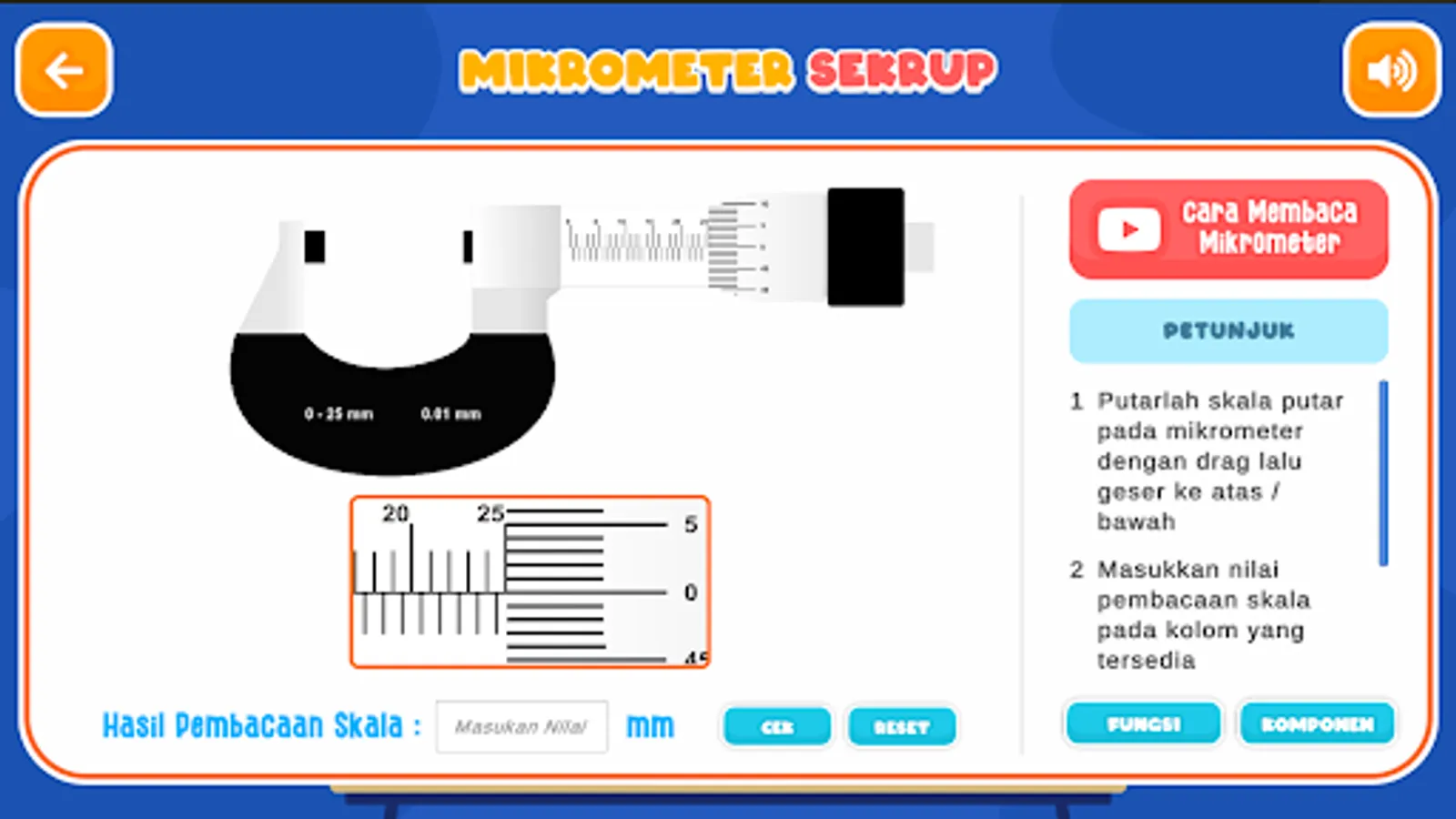 Physics Measuring Instrument Micrometer Screw & Caliper | This application contains a simulation of a screw and slide micrometer measuring instrument. The user can set the Micrometer and Caliper as the original and enter the length value according to the micrometer or caliper that has been set. There is also an explanation of the functions and components of the screw micrometer and caliper