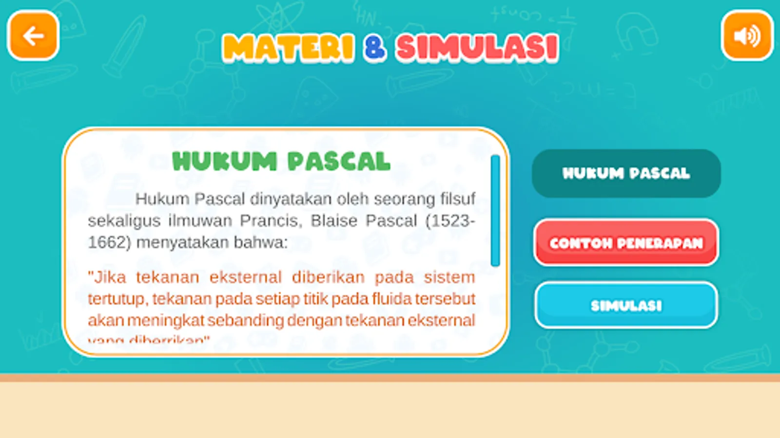 Pascal's Law Physics This application contains learning about Pascal's law of physics which is presented with a simulation view of the process of Pascal's law. There are also examples of application in everyday life.