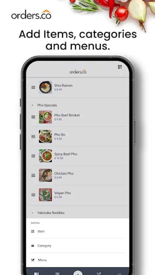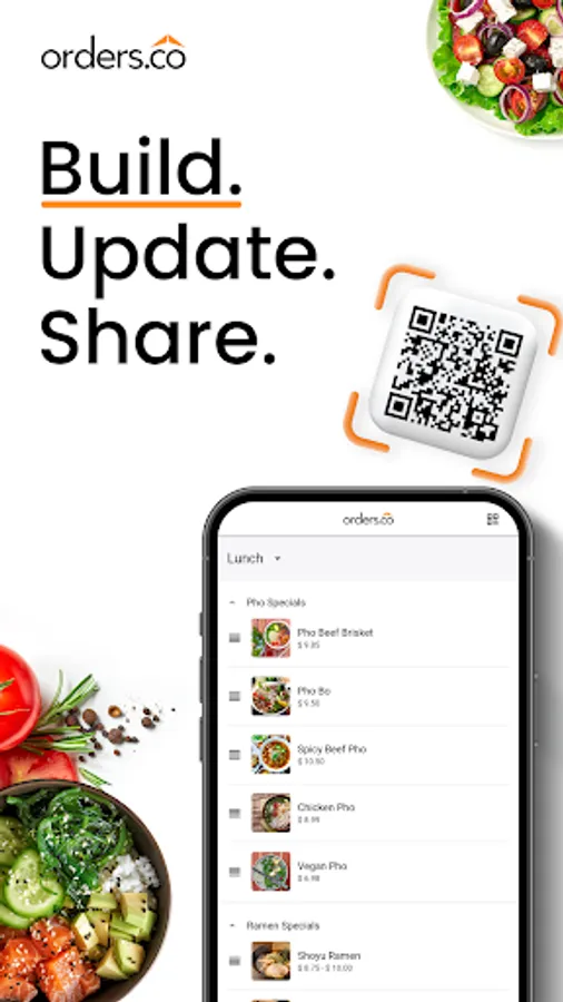 Technology is advancing all around us, but restaurants are still using printed menus. Give your customers a refreshing ordering experience with this QR Menu Maker tool from Orders.co. QR Menu Maker allows you to build your full in-store or online menu right from your smartphone. Upload pictures, edit descriptions, and even fill out nutritional information. Once your menu is complete, simply press the QR icon to generate your menu’s QR code!