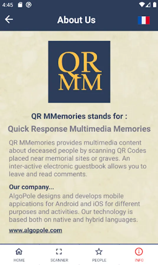 QR MMemories stands for Quick Response Multimedia Memories. QR MMemories provides multimedia content about deceased people by scanning QR Codes placed near memorial sites or graves. An inter-active electronic guestbook allows you to leave and read comments.