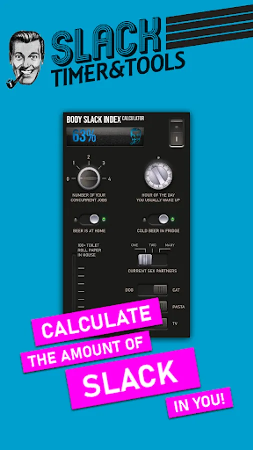 By simply hitting some switches and turning some knobs, this part of the app helps you to calculate the amount of Slack in you.