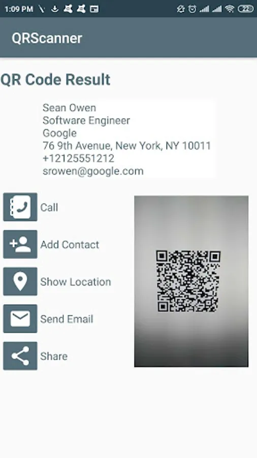 This qr reader helps to scan address books. If the address book has email then this bar code reader or qr reader app will show you an option to send an email. If it has a phone number then you will have two options such that you can add this number to your contacts or you can call that person directly.