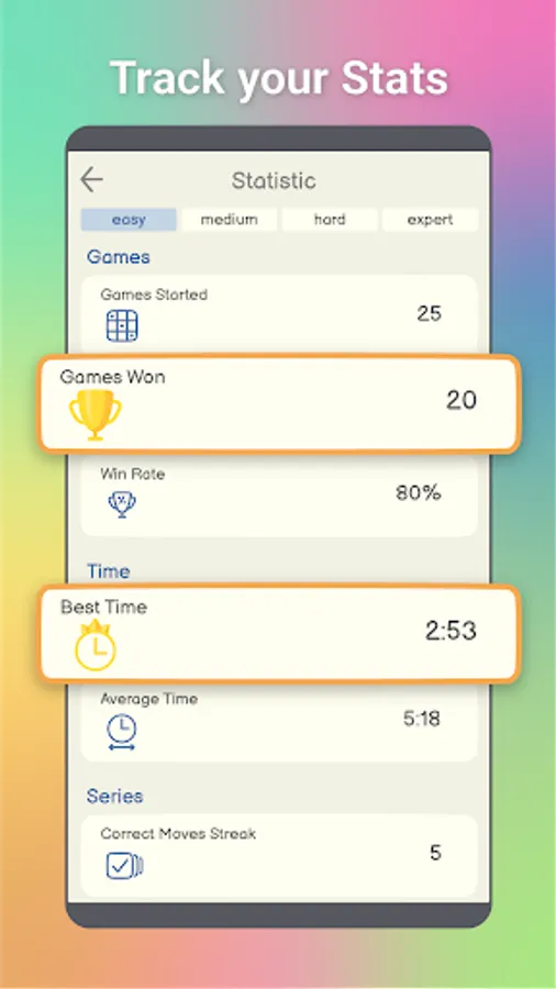 📊 Statistics Tracking: Stay motivated and track your progress with our comprehensive statistics feature. Classic Sudoku records your performance across different difficulty levels, allowing you to monitor your improvement over time. Analyze your success rate, completion time, and other key metrics to gauge your mastery of the game.