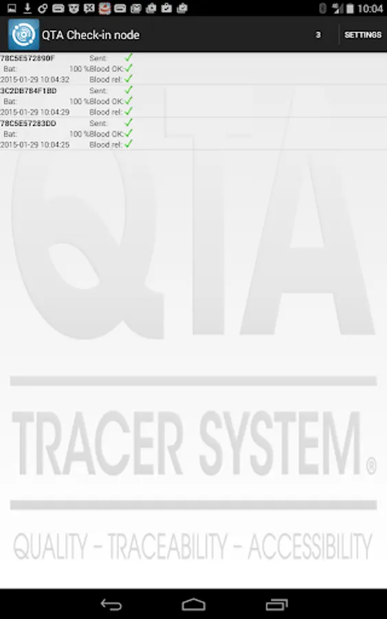 QTA Check-In nodes placed in various rooms/departments/hospitals help keep track of where the blood bag has been. When a blood bag with a QTA Tracer passes a QTA Check-In node it is registered in the node and information instantly uploaded to the QTA Web Portal where it can be accessed. The information includes the GPS based location of the QTA Check-In node.