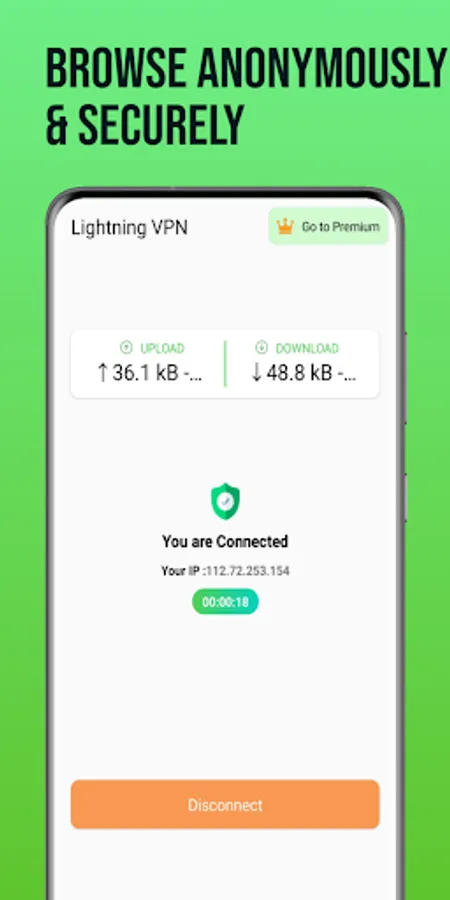Lightning VPN, the unlimited, fast VPN for Android, not only enables you to connect to a proxy server all around the world, but it also makes sure to deliver a server with unlimited bandwidth and high-speed so you can easily download large media files at the highest speed.