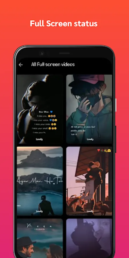 You can play each Videos Song Status and easily download a status video for WhatsApp. Save and set video song status as a WhatsApp Video Status.