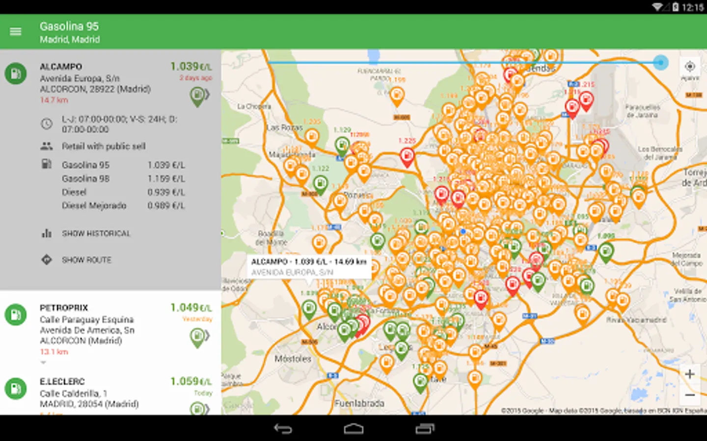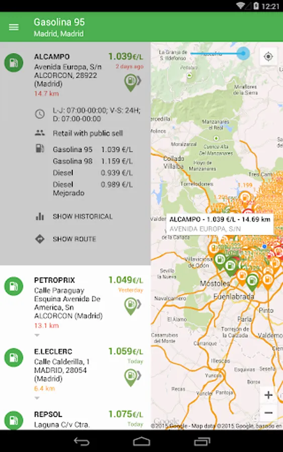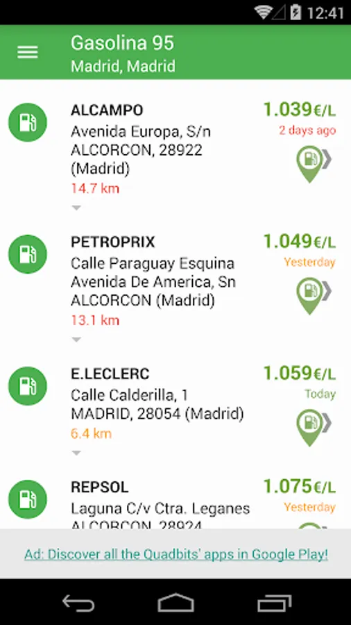 - Automatic or manual location: Get the prices around your current position or type a custom address.