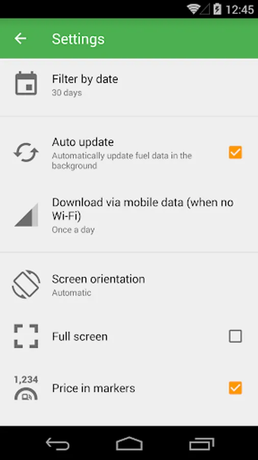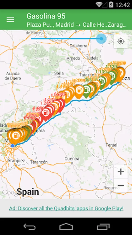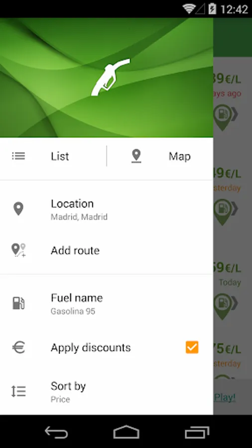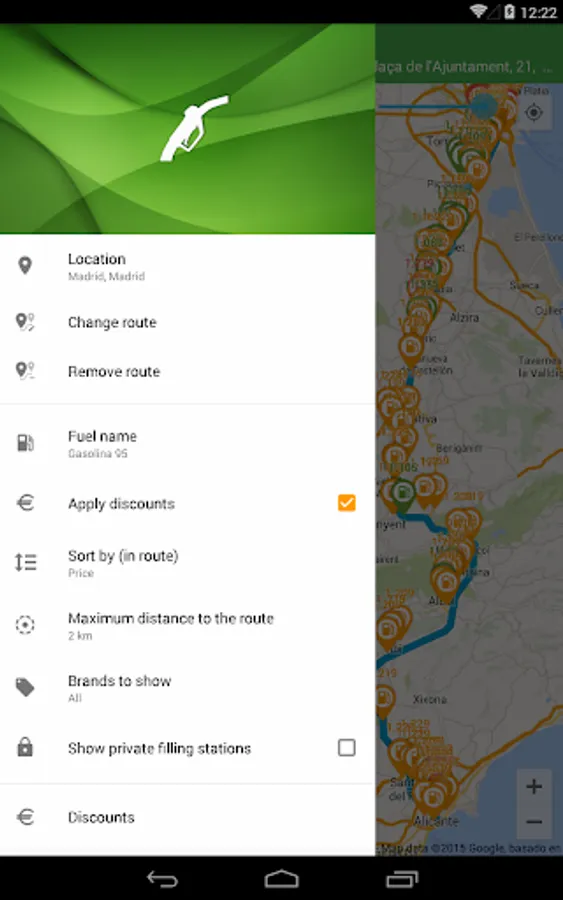- Choose the maximum distance to the filling stations, from 1 to 200 km (some values require supporting the app through subscription).