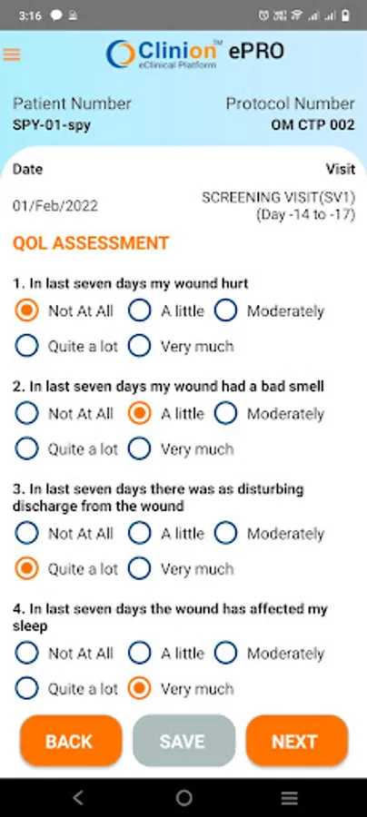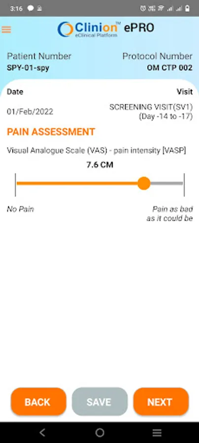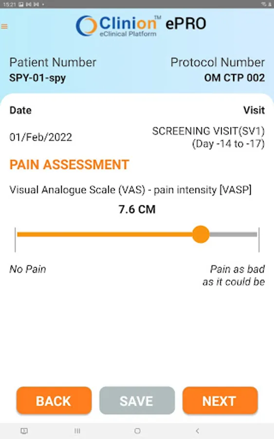Clinion OM-CTP-002 ePRO (e Patient Reported Outcomes) application is a module of Clinion EDC where patient information is captured at source. The patient enters his information into the patient diary App and it is synced and stored into the EDC.