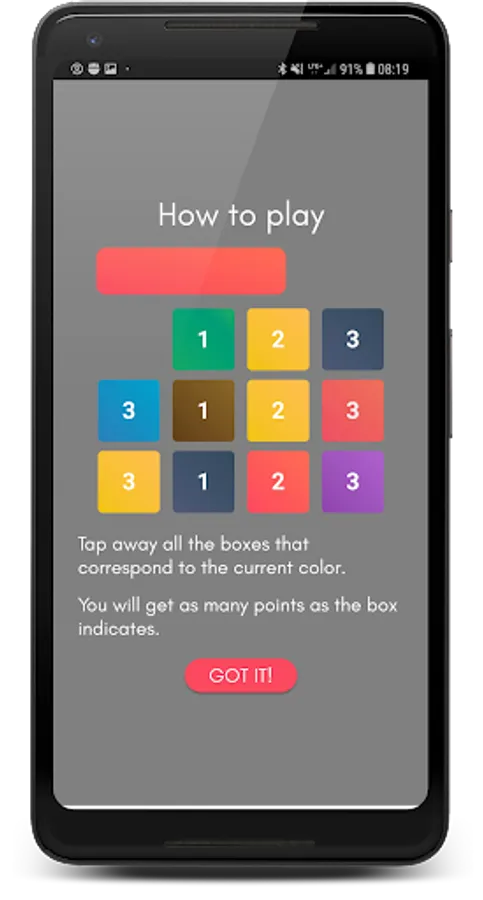 Break all the boxes that correspond to the currently shown color. You will get as many points as the box indicates. The longer you go without a mistake, the more points you will be receiving. Try not to fail! It will break your streak. The time is running faster and faster making the game even more challenging!