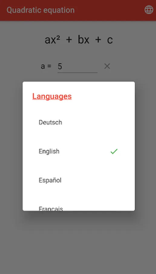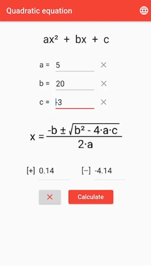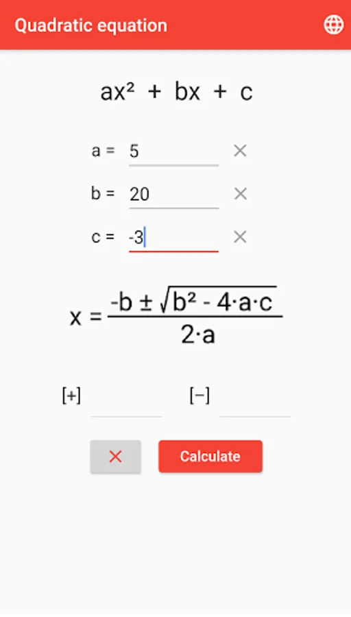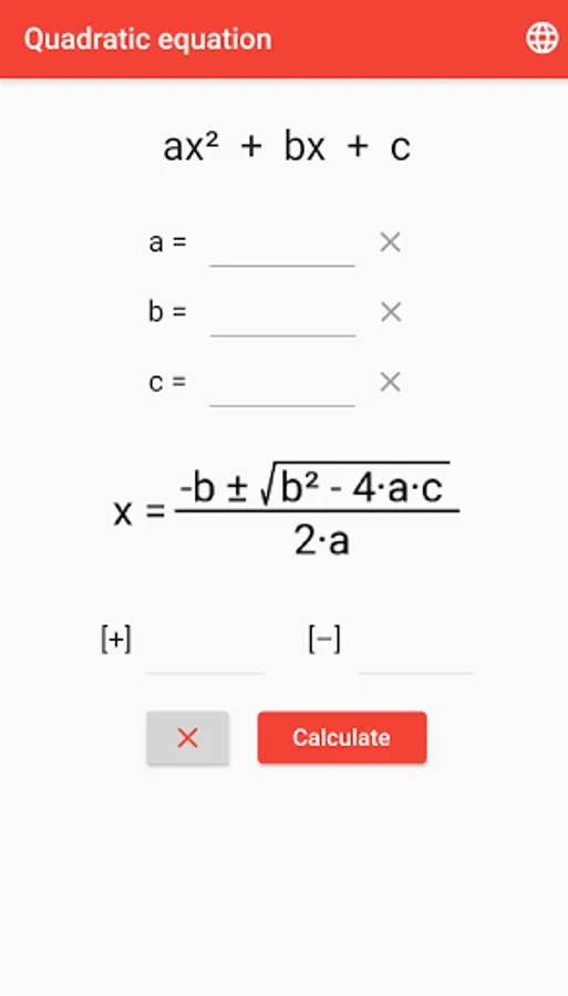 To obtain the result of the quadratic equation that you want to solve, you only have to fill in the three fields that you will find in the application and press a button. The calculator will run the formula and return the possible solutions to the equation, or display a warning if there is no real solution for the function.