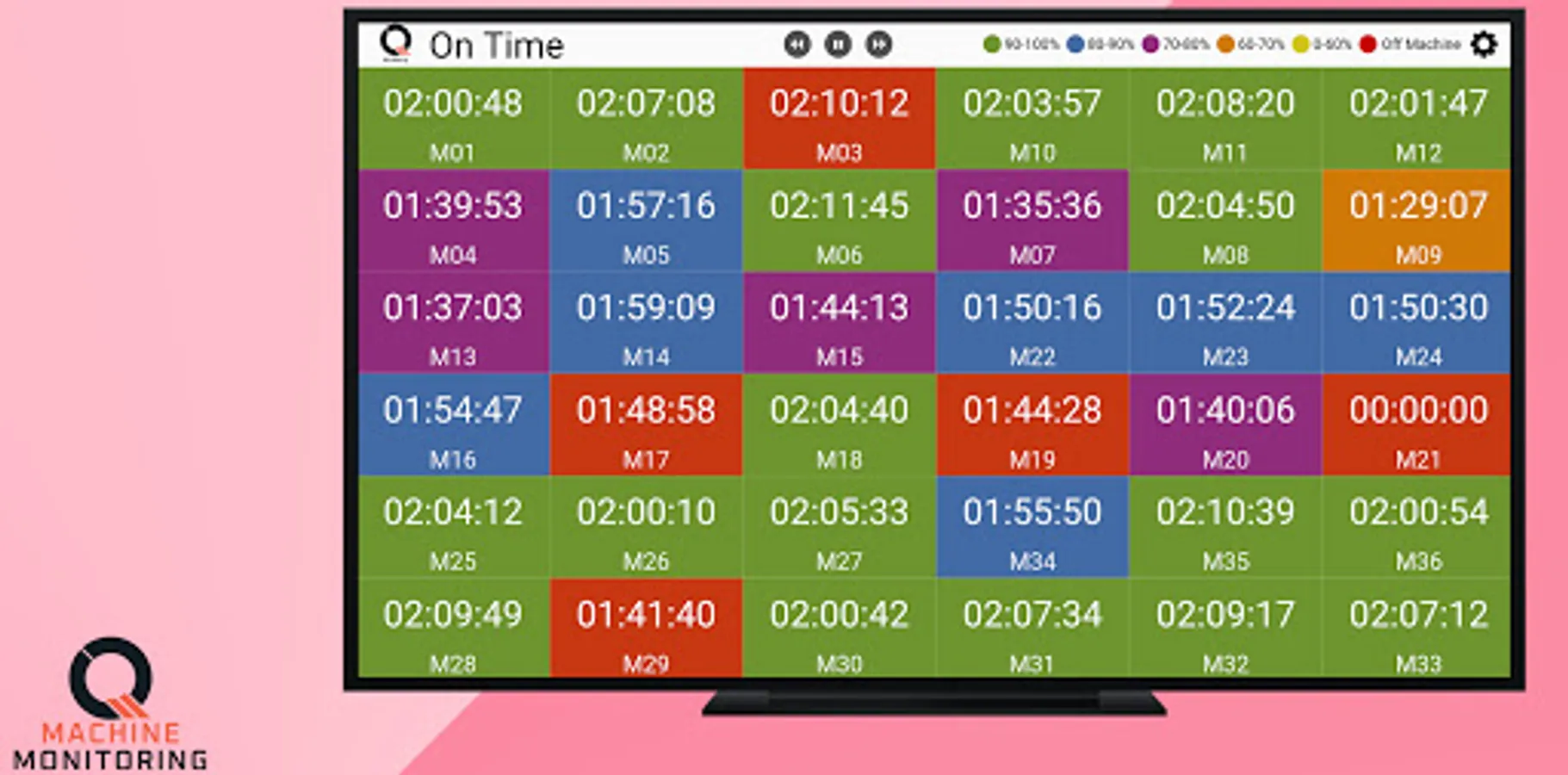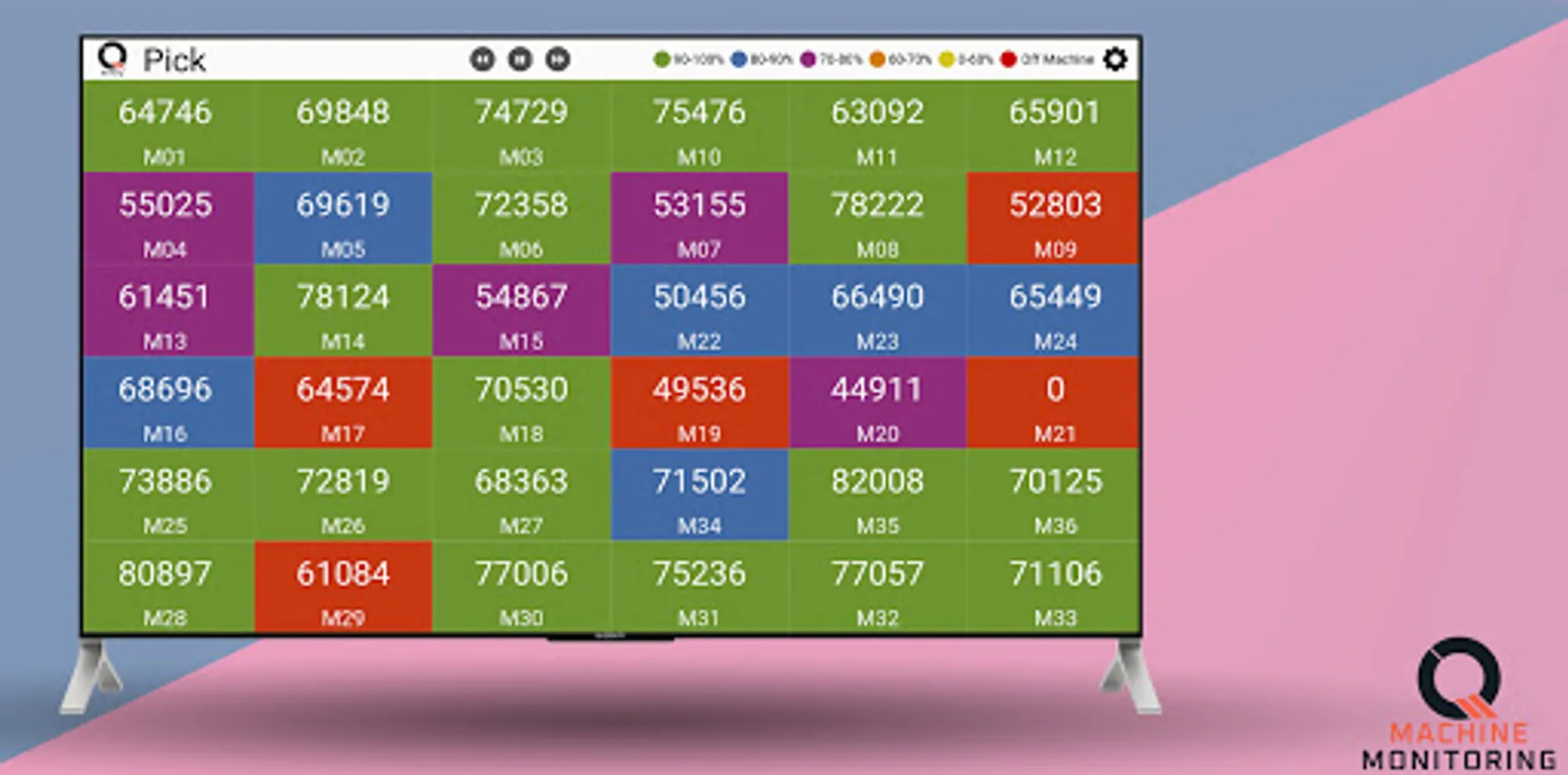 - Colored Indication of Machine Status for Machine Running, Machine Stopped.