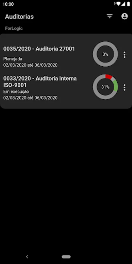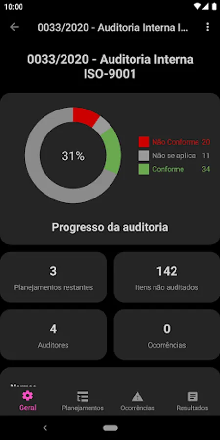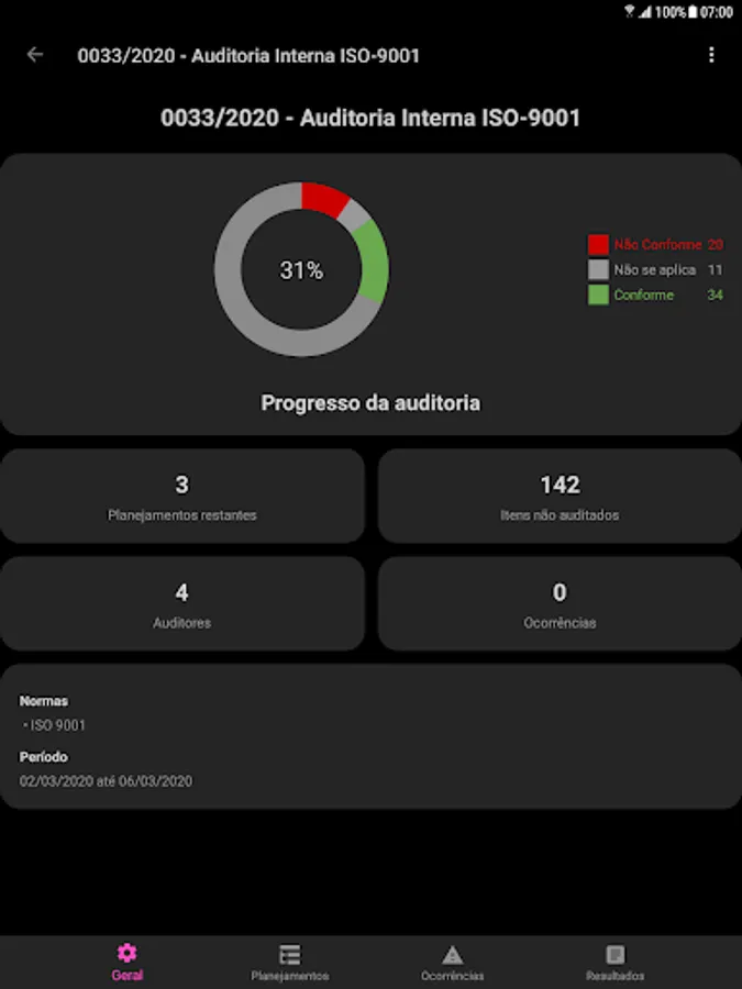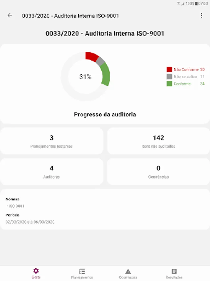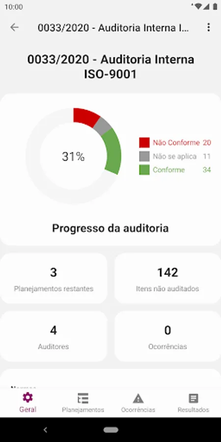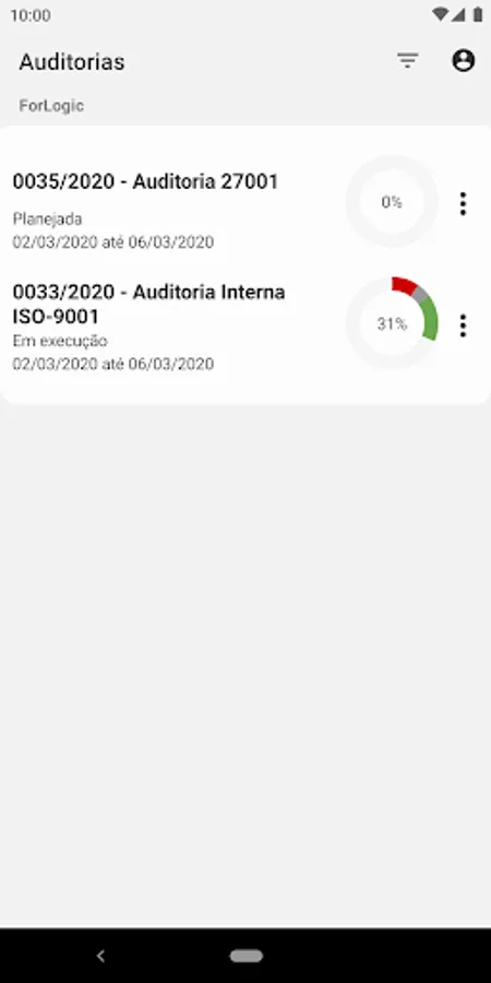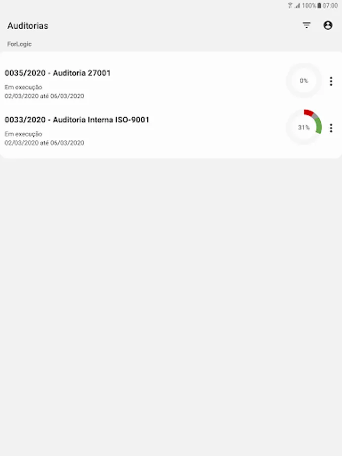 Through a simple and intuitive dashboard, Qualiex Auditorias App allows you to easily follow the progress of the audit, viewing the percentage of items already audited.