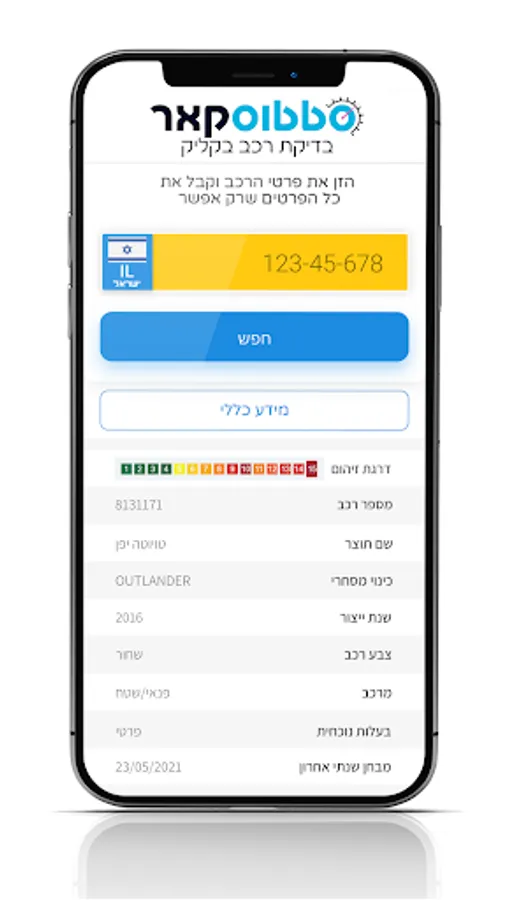 רגע לפני שאתם רוכשים רכב יד שנייה - כל המידע שתרצו לדעת על הרכב לפי מספר רכב: שנת יצור, מועד טסט קרוב, צבע הרכב, קיום תו נכה, מקומות ישיבה, אביזרי בטיחות ועוד... המידע מתעדכן על בסיס יומי ובקרוב יעלות שירותים נוספים כדי לתת לכם את כל המידע שאתם צריכים לפני הרכישה.