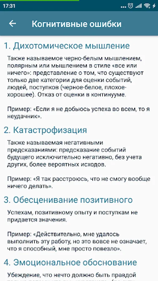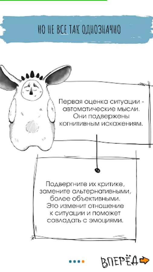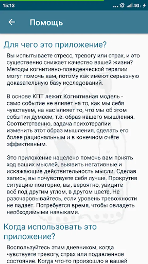 The CBT is based on the “Cognitive Model” - the event itself does not affect how we feel, we are affected by what we think about this event, i.e. way of thinking. Accordingly, the task of psychotherapy is to change this way of thinking, to make it more rational and ultimately effective. This application aims to help you understand your thoughts, identify negative and distorting reality thoughts.