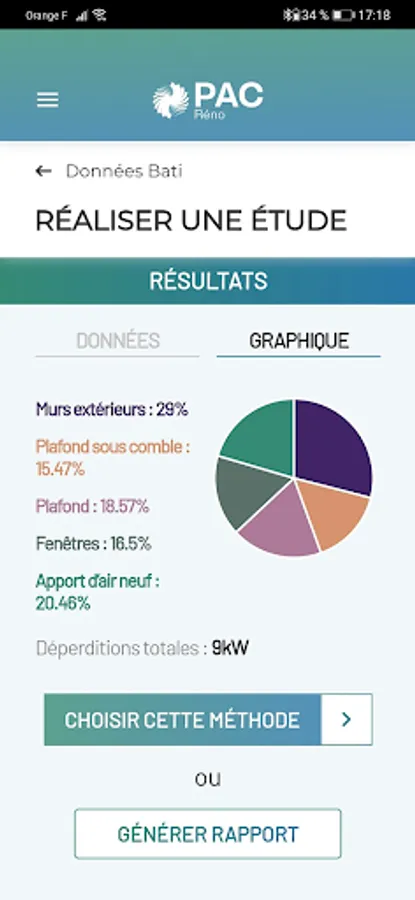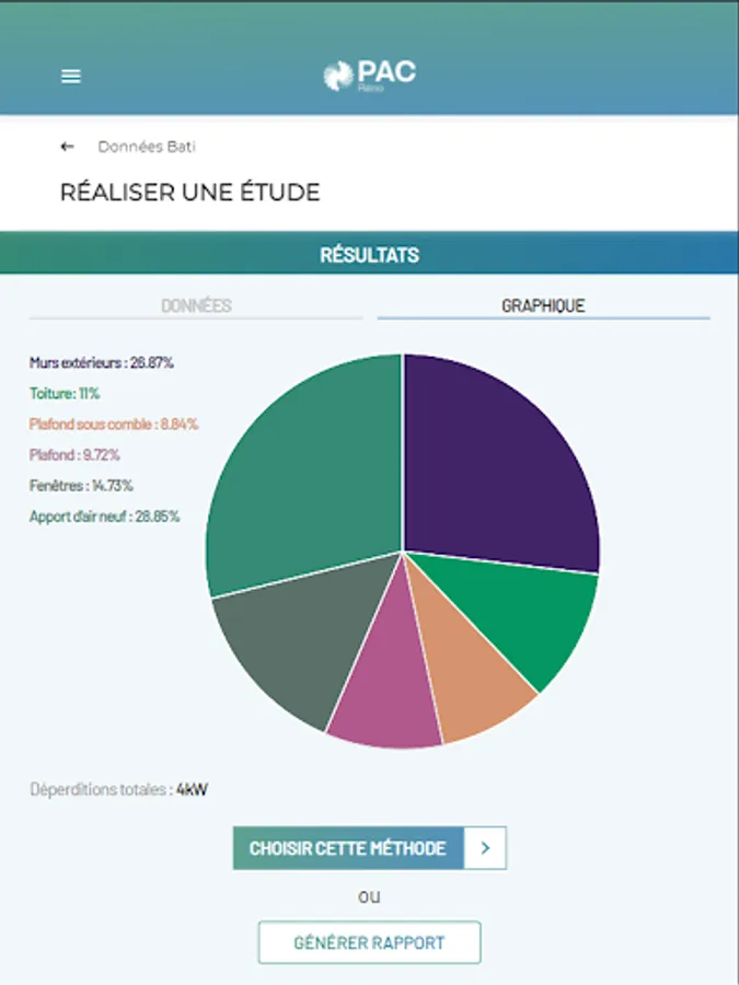Regardless of the approach chosen, the study carried out by the installer from PAC'Réno will allow him to estimate the power of the heat pump to be installed, to select the appropriate equipment from a database and to estimate consumption forecasts for the proposed installation. At the end of the study, the user can generate a detailed report and transfer it, if desired, to employees in his company, or to his client to justify his business proposal.
