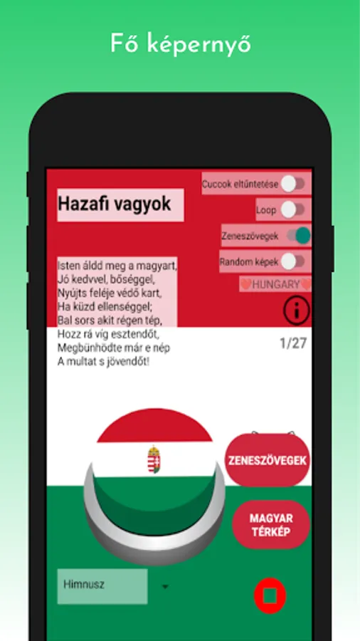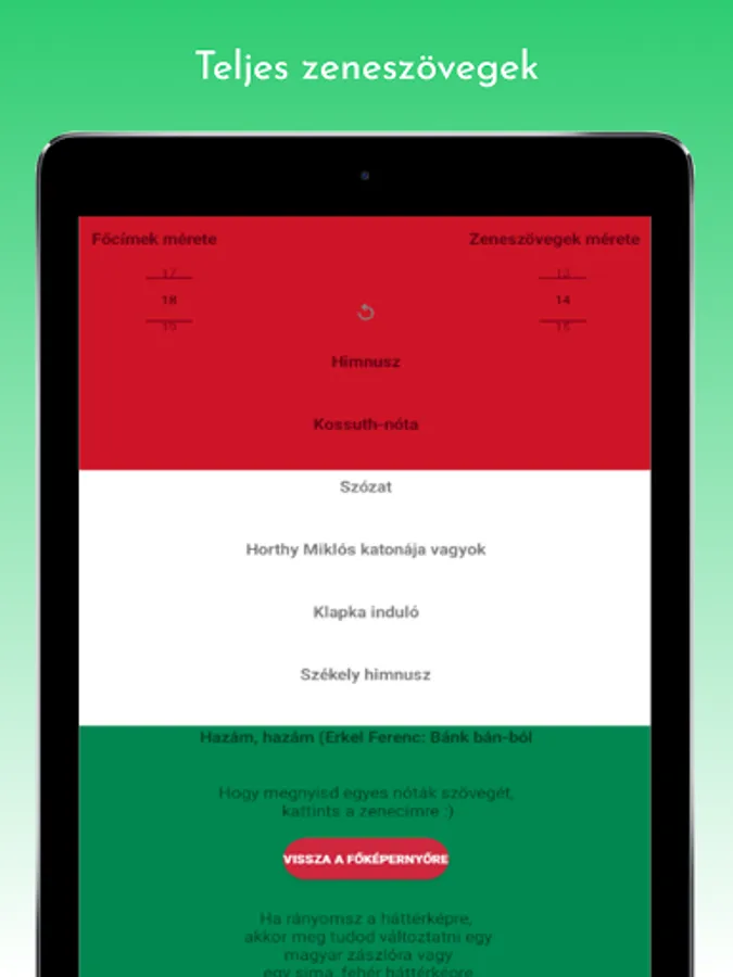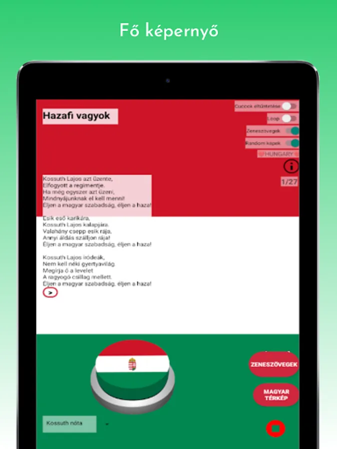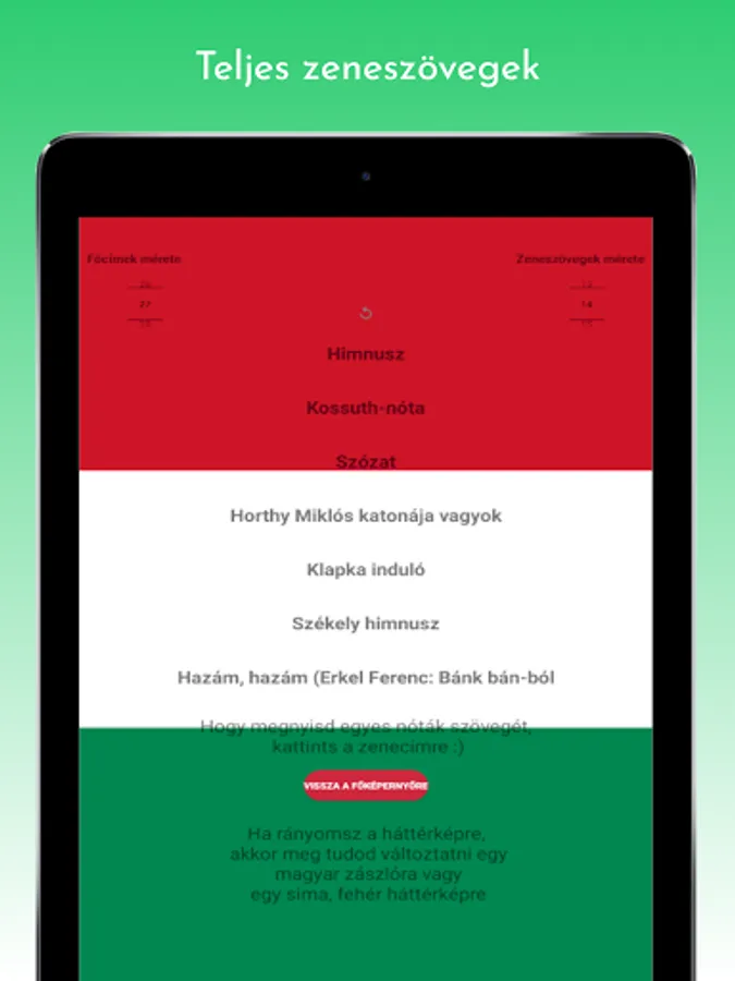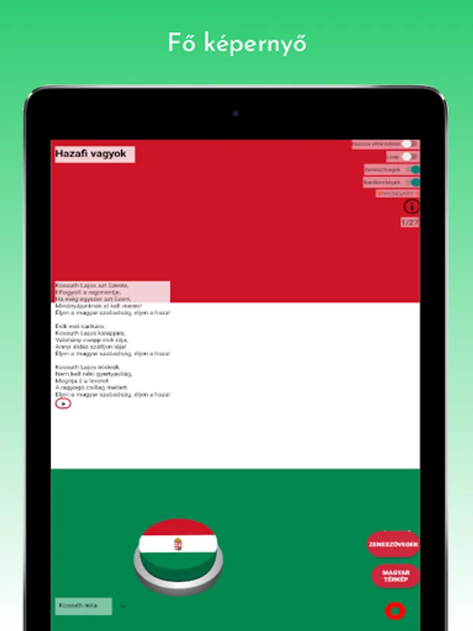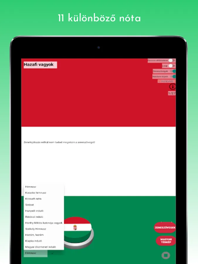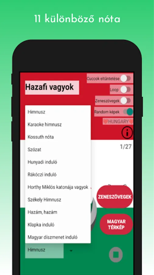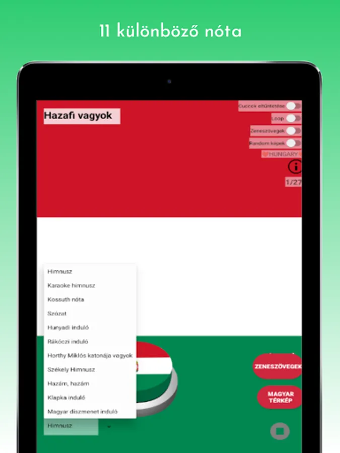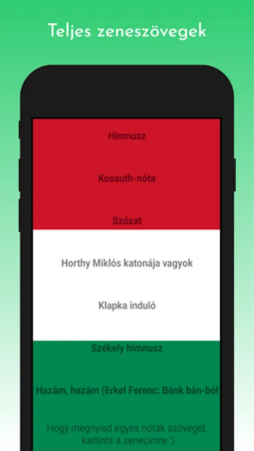Anthem, Anthem (karaoke version), Kossuth song, Szózat, Hunyadi marcher, Rákóczi marcher, I am a soldier of Miklós Horthy, Székely anthem, As an exile; who wanders, Klapka starts, Hungarian procession starts