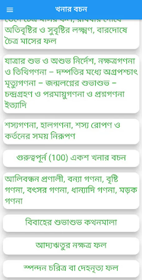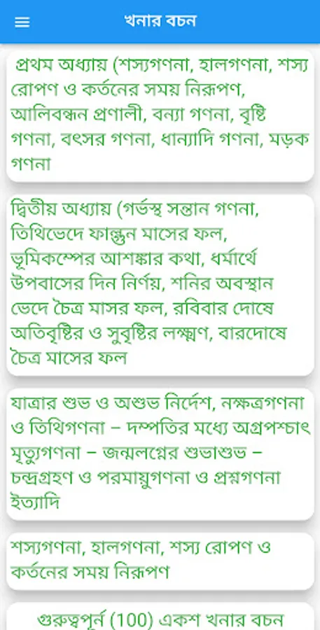 Khanar Bachan is basically a rhyme based on agriculture. Written between the 8th and 12th centuries. According to many, these rhymes are composed by a brilliant Bengali woman named Khana who specializes in astronomy. However, there are differences. The words of innumerable mines have been associated with the life of the people of rural Bengal for ages. It is rumored that Khanar's residence was in Deulia village (now Chandraketugarh archeological site, now known as Khanamihir's mound) in Barasat Sadar subdivision of North 24 Parganas district of West Bengal. He is even said to have been the tenth member of the Navaratna assembly of King Vikramaditya. Legend has it that Mihir, the son of Brahmihir or Barruchi, was her husband. These essays are divided into four sections. কৃষ nAccording to agricultural practices and superstitions. কৃষ nAgriculture Applied and Astronomy.