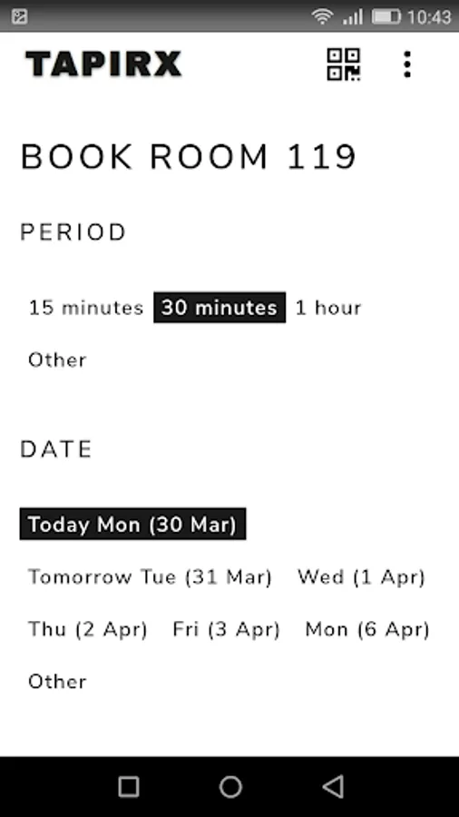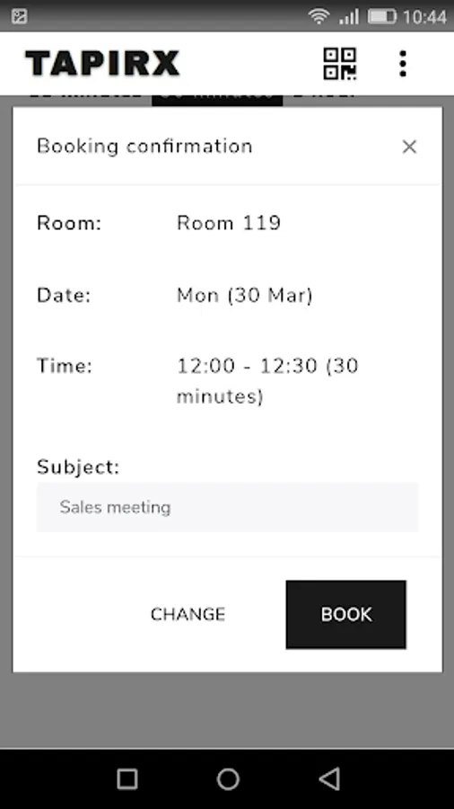 By using this app you can book meeting room directly. Just scan QR code from Tapirx device screen. With this app you can also edit or remove any of your bookings or book any other meeting room directly from your smartphone.