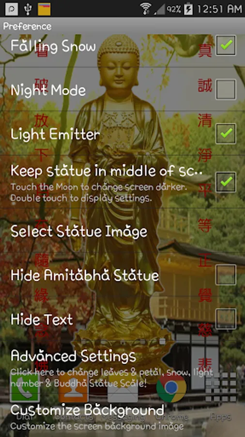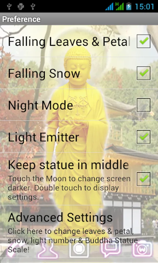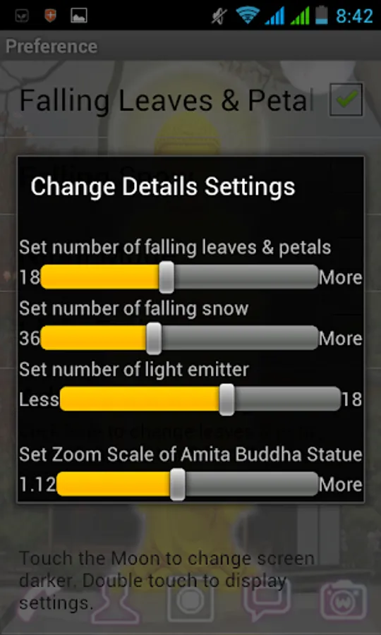 - There are options such as leaves falling, spot lights flying, snow falling. You can change background to day & night mode.