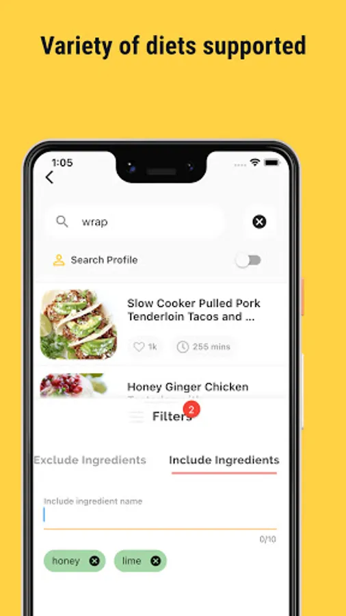 - Add ingredients to include/exclude in your recipe