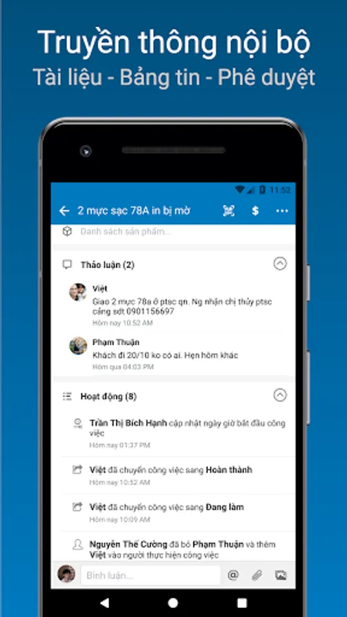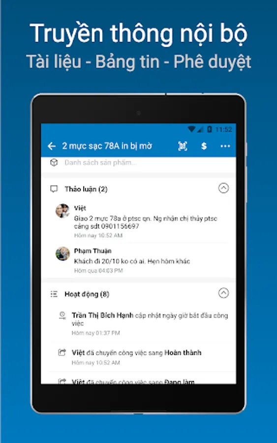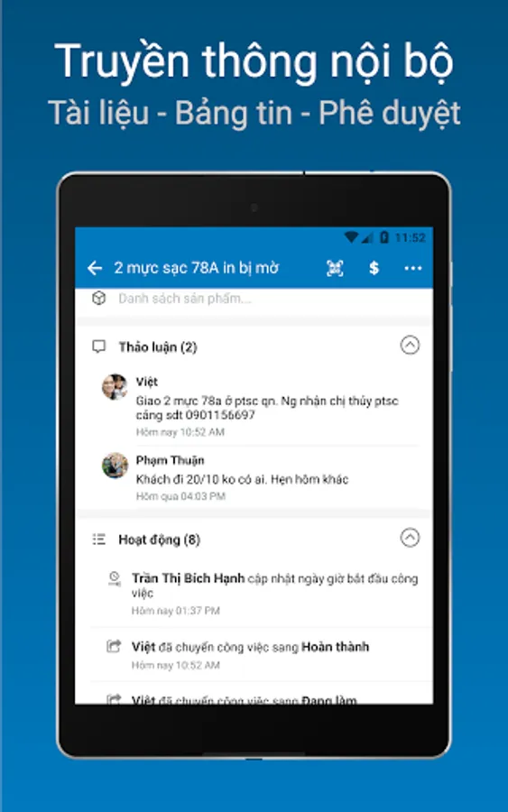 You create a job and provide the necessary information, the status of the work and the feedback will be instantly communicated to everyone. When the manager approves to close the job, everything related such as personnel performance, sales, cash flow, customer data will be automatically processed and stored for analysis reports anytime and anywhere. place.