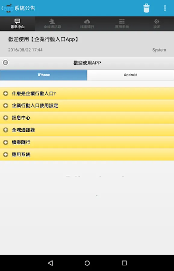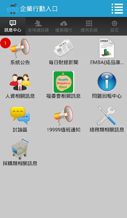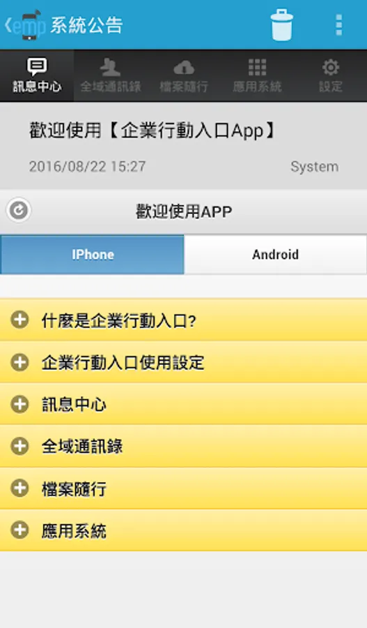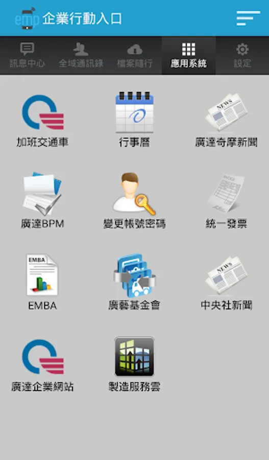 企業行動入口 ( EMP , Enterprise Mobile Portal ) 產品提供一個整合性的行動服務平台,可提供企業快速提供行動化服務. 並提供四種功能以支援企業系統行動化需求。