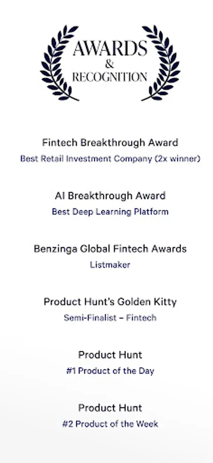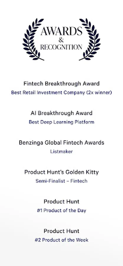 - FinTech Breakthrough Award for Best Retail Investment Platform
