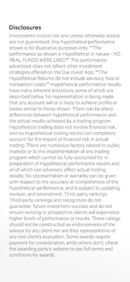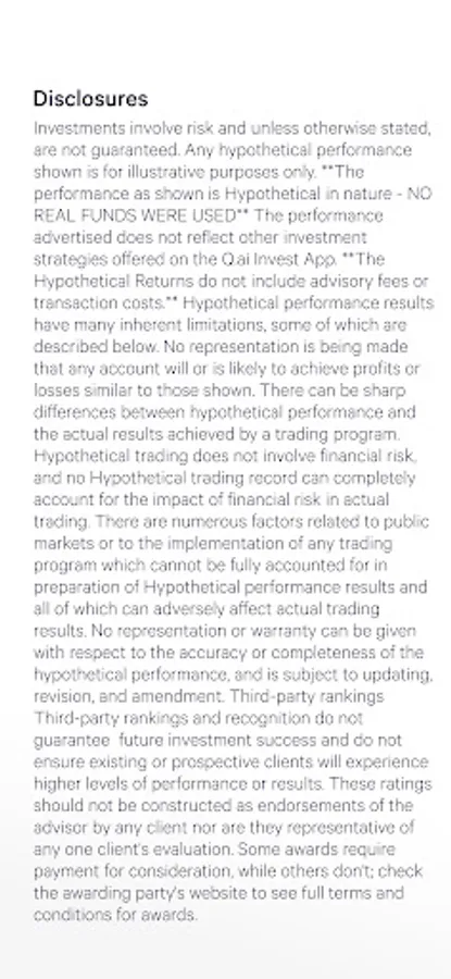 Investments involve risk and, unless otherwise stated, are not guaranteed. Any hypothetical performance shown is for illustrative purposes only. **The performance as shown is Hypothetical in nature - NO REAL FUNDS WERE USED** The performance advertised does not reflect other investment strategies offered on the Q.ai Invest App. **The Hypothetical Returns do not include advisory fees or transaction costs.** Hypothetical performance results have many inherent limitations, some of which are described below. No representation is being made that any account will or is likely to achieve profits or losses similar to those shown. There can be sharp differences between hypothetical performance and the actual results achieved by a trading program. Hypothetical trading does not involve financial risk, and no Hypothetical trading record can completely account for the impact of financial risk in actual trading. Numerous factors are related to public markets or the implementation of any trading program that cannot be fully accounted for in the preparation of Hypothetical performance results and can adversely affect actual trading results. No representation or warranty can be given with respect to the accuracy or completeness of the hypothetical performance and is subject to updating, revision, and amendment. Third-party rankings and recognition do not guarantee future investment success and do not ensure existing or prospective clients will experience higher levels of performance or results. These ratings should not be constructed as endorsements of the advisor by any client, nor are they representative of any client's evaluation. Some awards require payment for consideration, while others don't; check the awarding party's website to see full terms and conditions for awards.