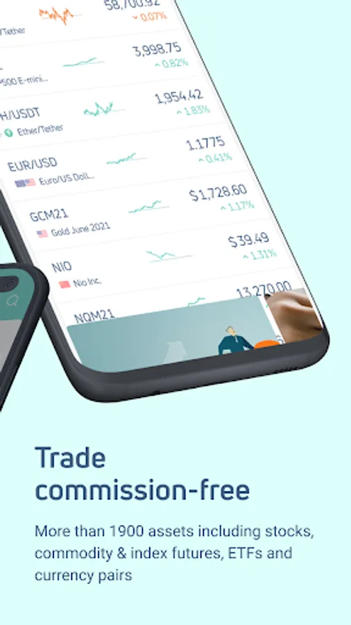 Buy or sell 1900+ assets including: USA and European stocks, commodity and stock index futures, ETFs and currency pairs. There are no trade commissions, borrowing fees, or any other type of fees.