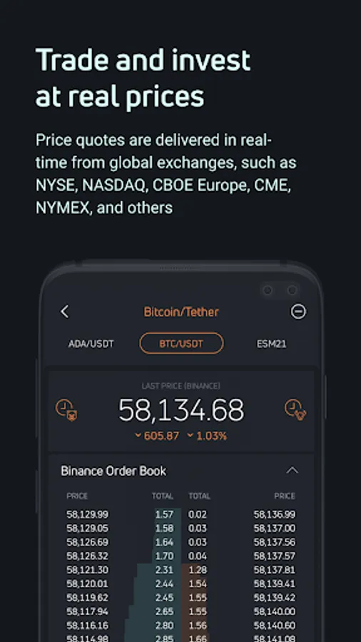 Trade stocks, futures, ETFs, and various currency pairs at real-time spot prices of global exchanges free of any fees or commissions.