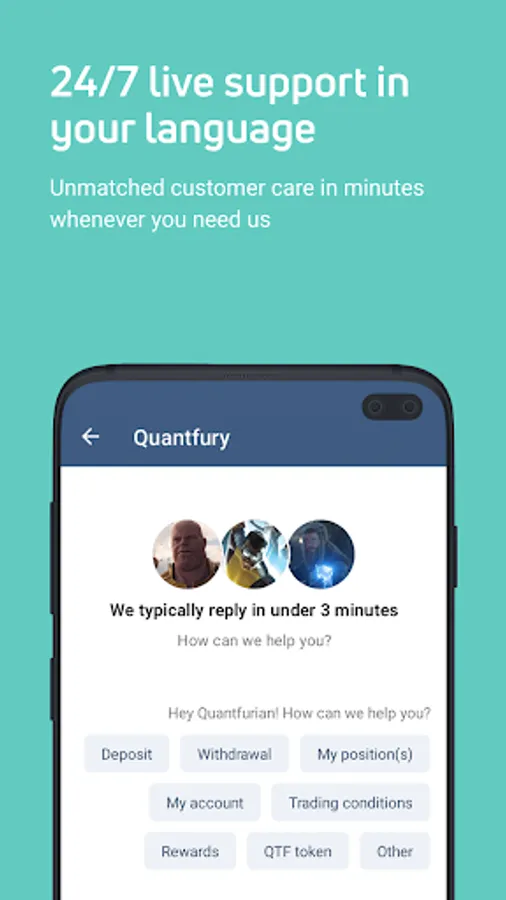 Quantfury industry-leading, blazing-fast support team is available in the app 24/7 to assist Quantfurians.