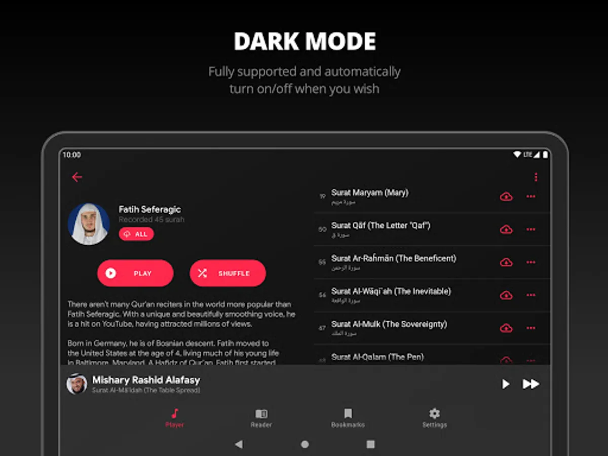 Our app includes a wide range of features and tools to help you deepen your knowledge and understanding of Islam. With Quran Pro, you can access the full Quran with translations in more than 50 languages, recitations by different reciters, and various reading modes to suit your preferences. Some of our popular reciters include Sheikh Abdul Rahman Al Sudais, Sheikh Mishary Rashid Alafasy, Sheikh Saad Al Ghamdi, Sheikh Abu Bakr Shatri, Sheikh Abdullah Al Matrood, and many more.