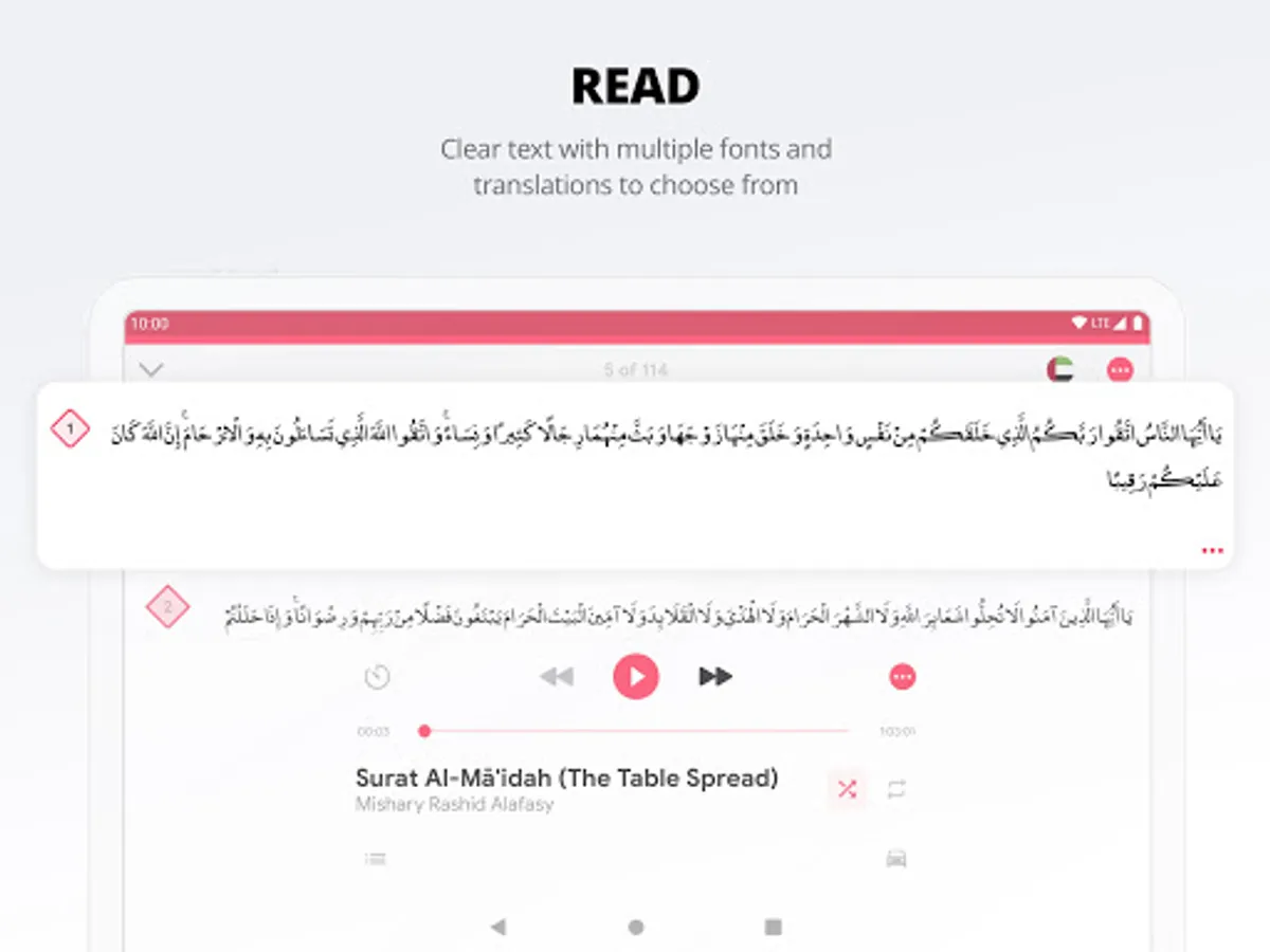 Quran Pro is the ultimate Quran app for every Muslim. With over 80 reciters and translations in multiple languages, our app offers a comprehensive platform for Muslims to connect with the holy Quran.