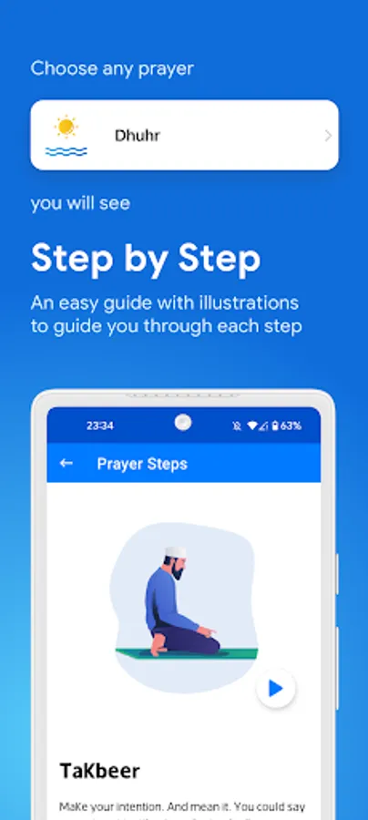 2- Prayer Guide: Salat provides step-by-step instructions for performing each prayer, including the opening takbeer, recitation of Quranic verses, and the final salaam.