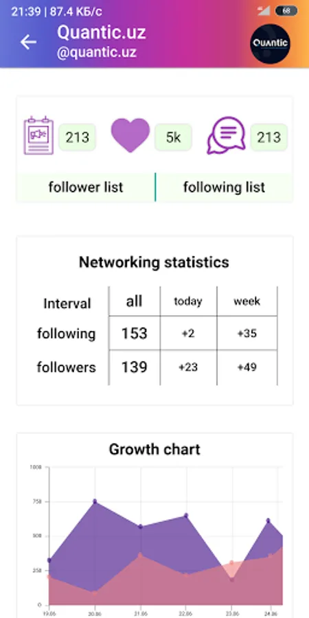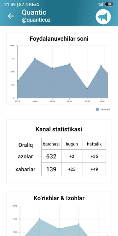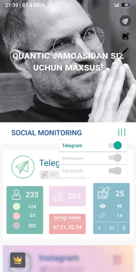 Ilova yordamida Telegram, Instagram, Facebook hamda Youtube ijtimoiy tarmoqlaridagi kanalingiz, sahifangiz statistikalarini muntazam va samarali kuzatish imkoniyatiga ega bo`ling.