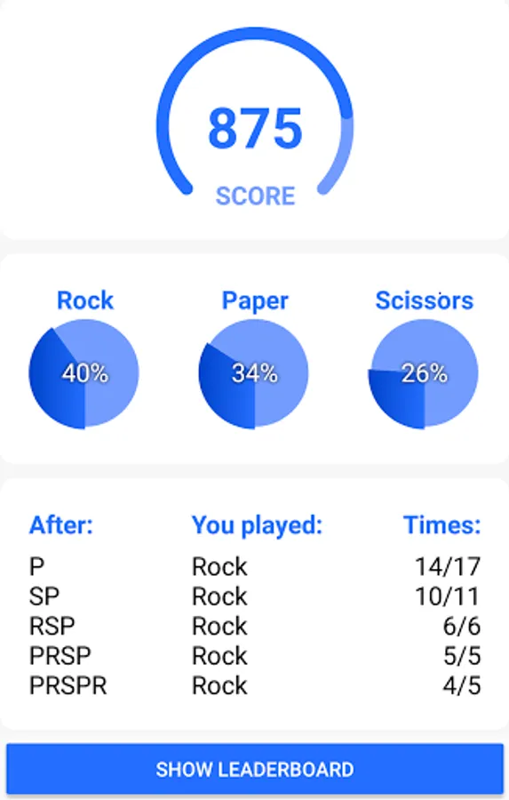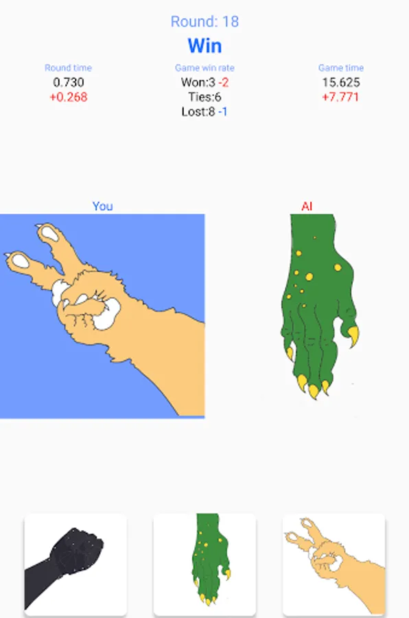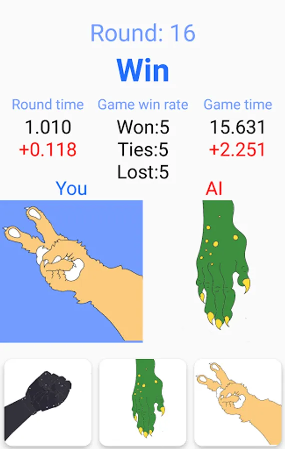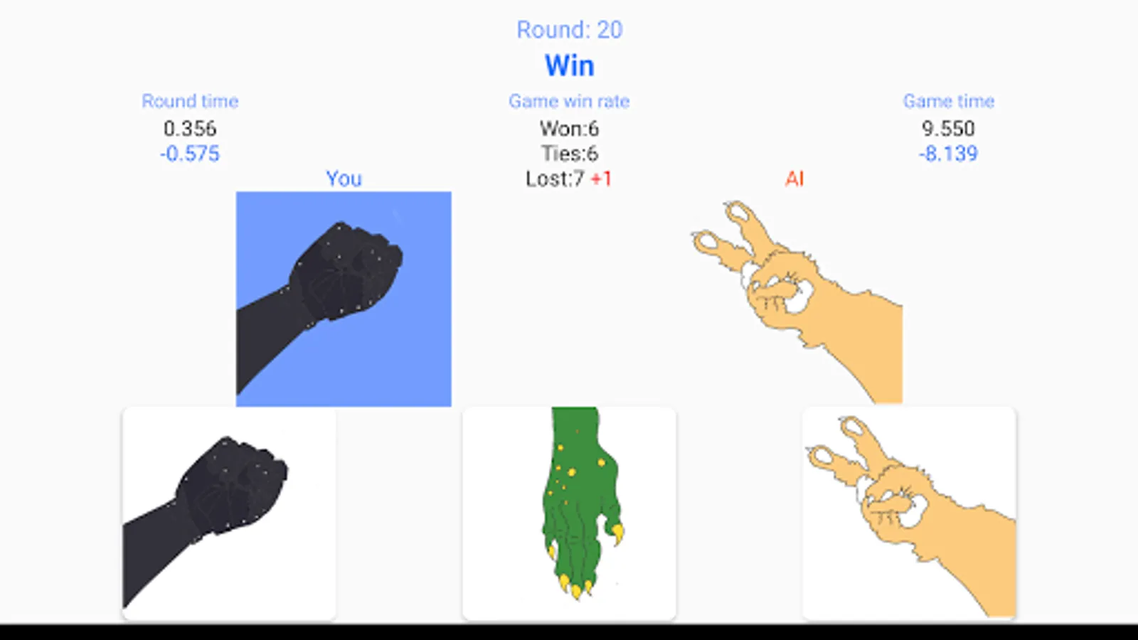 Rock-paper-scissors, also known as "Rochambeau, roshambo, or ro-sham-bo," is a simple game, yet surprisingly challenging when you play many rounds against an AI.