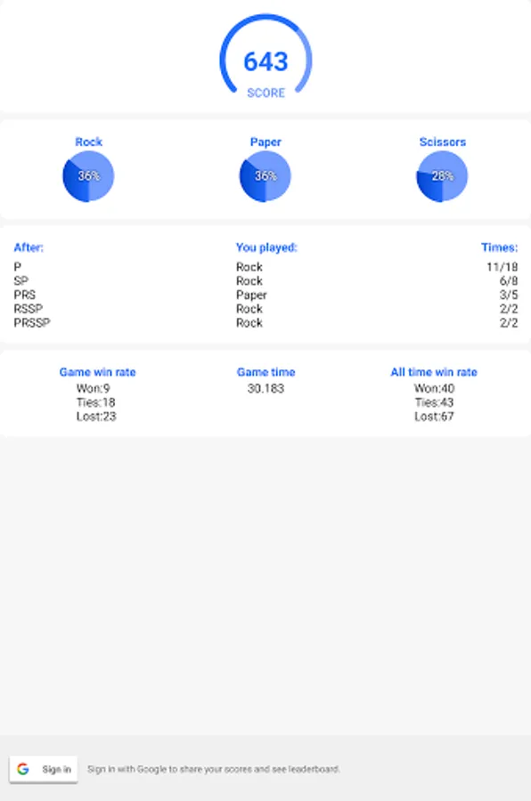 There is actually game theory in playing the game against others: people adopt a "win-stay lose-shift" strategy - a conditional response. For example, if someone plays rock and loses, then they will be more likely to switch the next round. You can get paper scissors rock practice for tournaments by improving how random you are, playing this game, and becoming less predictable!