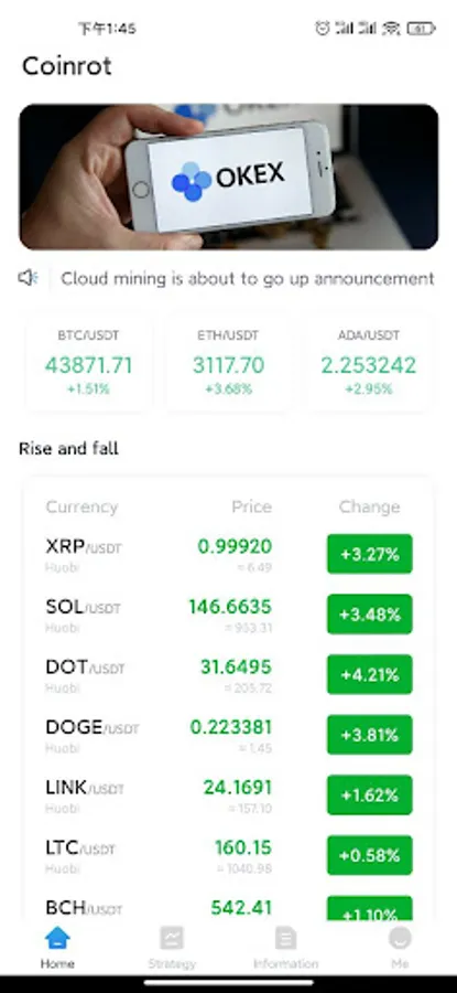 Coinrot is a smart trading app that runs automatically and continuously in accordance with your strategy. It runs around the clock on the cloud. It can help you follow your strategy to operate your trading on encrypted digital asset trading platforms (exchanges). It is your asset management good helper.
