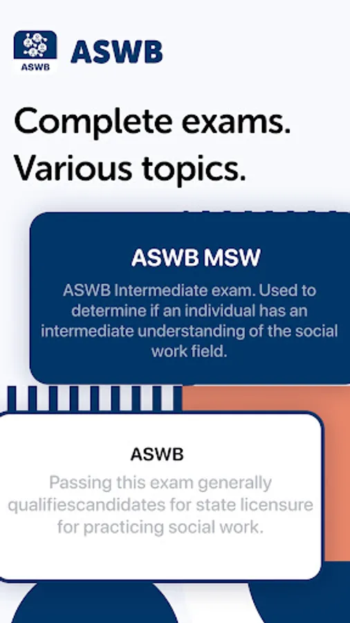 ASWB is a nonprofit organization composed of the social work regulatory boards and colleges of all 50 states. ASWB maintains the social work licensing examinations that are used to test a social worker’s competence to practice ethically and safely. Our app is organized to closely follow the actual objectives for ASWB test. These ASWB practice tests contain questions from four main knowledge domains: