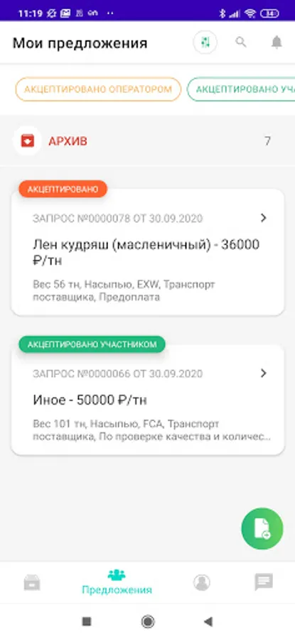 Suppliers - bidders have the opportunity to view lots for the purchase of sunflower, flax, mustard, and other products and make an offer to sell them directly from the application.